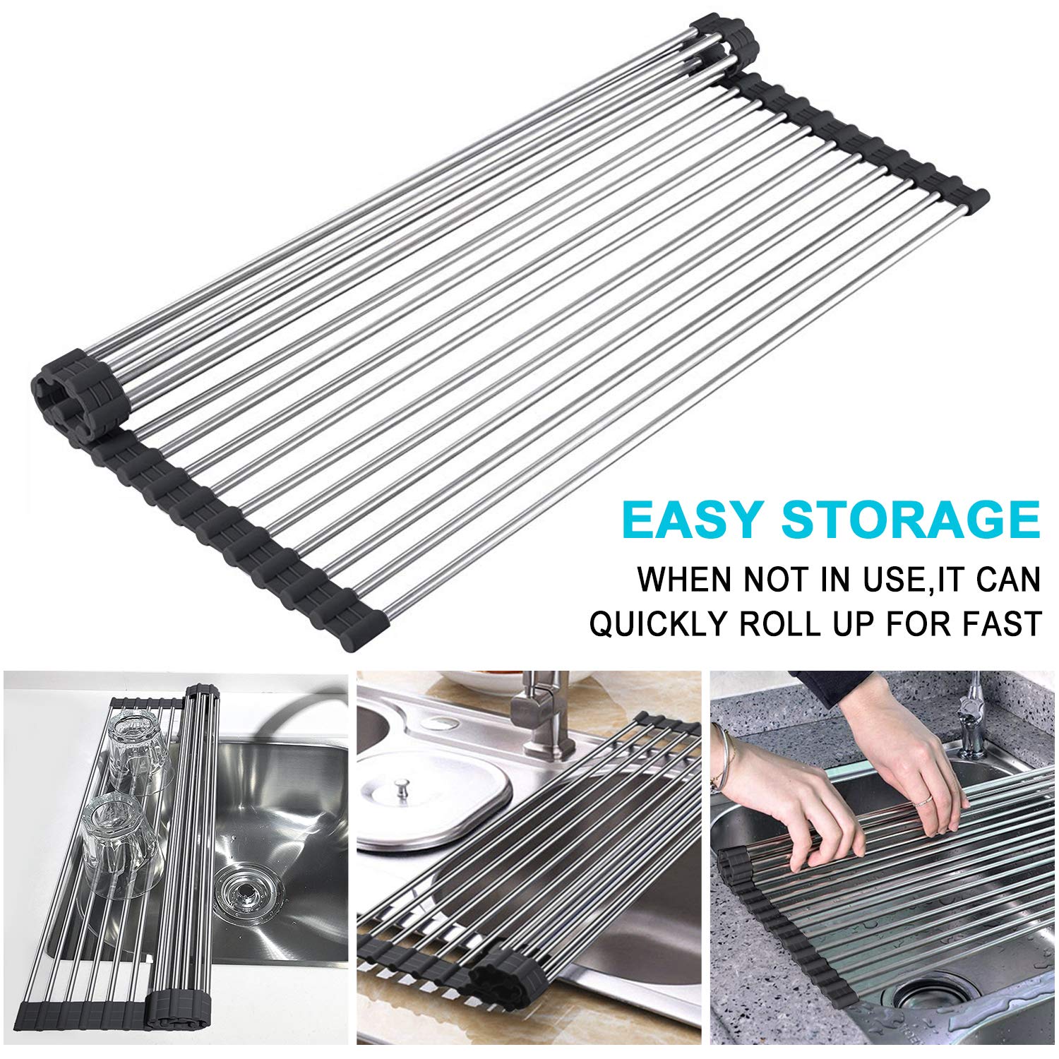 Multipurpose Foldable Over Sink Roll Up Mat Stainless Steel with Silicone Rims Large Dish Drainers Rack, for Dishes, Cups, Fruits Vegetables (Black, 17.6" x 16")